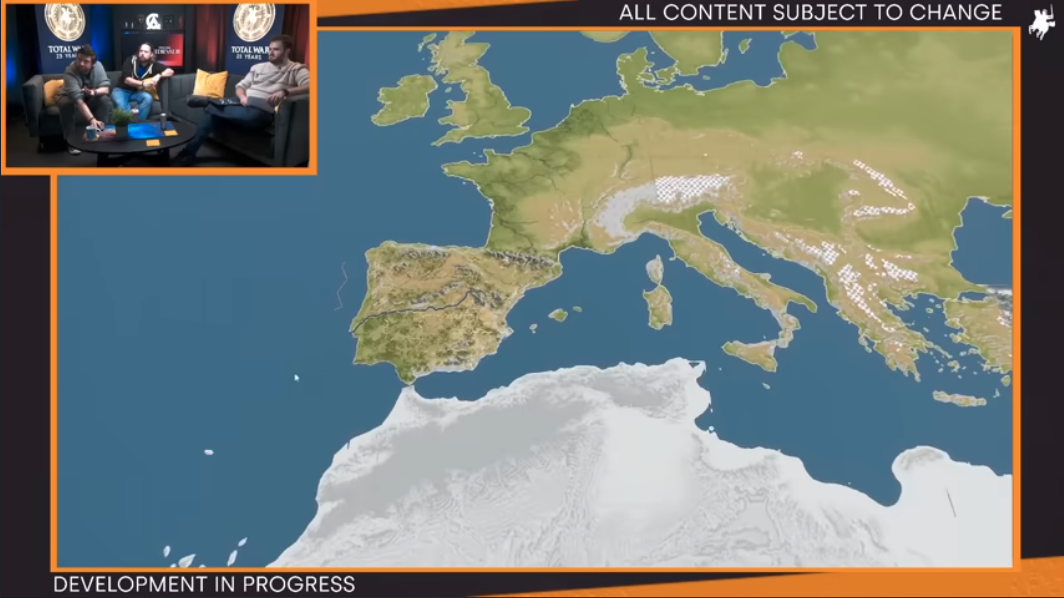 Mimoriadne dôležitým aspektom je i mapa kampane. V živom vysielaní sme sa mohli pozrieť na jej kontúry, nečakali nás však žiadne prekvapenia. Pobrežie Stredozemného mora vrátane severnej Afriky a väčšina Európy okrem jej najvýchodnejších a najsevernejších kútov. Ak to neušlo mojej pozornosti, nenaskytol sa nám pohľad na oblasť Blízkeho východu, zrejme sme tak nevideli mapu v jej celom rozsahu. Najviac času však bolo venovaného Pyrenejskému polostrovu, čo bola tiež časť mapy, ktorá bola očividne najprepracovanejšia. Zaujímavé je, že len tento kúsok sveta bol rozdelený na tridsiatku regiónov, z čoho môžeme ľahko odvodiť, že aj mapa v rozsahu Medieval II či Rome II by tu bola rozdelená na stovky samostatných regiónov.